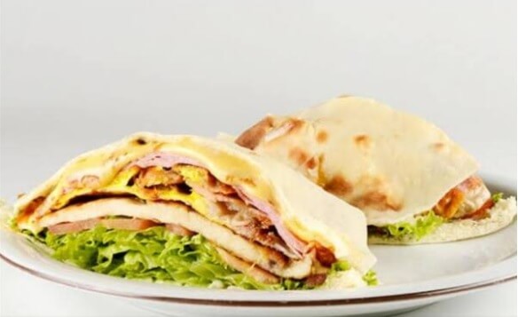 Pão sírio, calabresa defumada aurora .ovo . Bacon .presunto . Queijo salada e maionese verde
