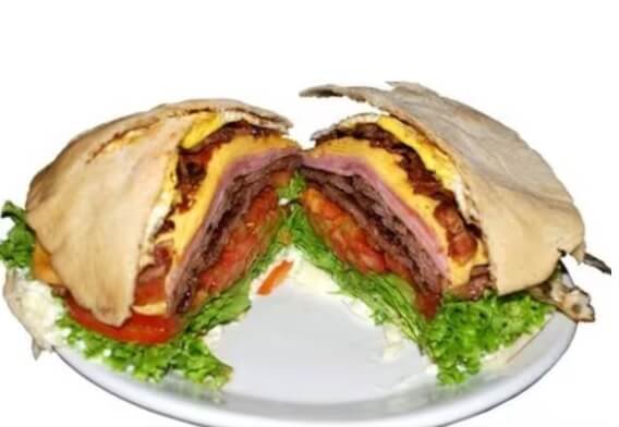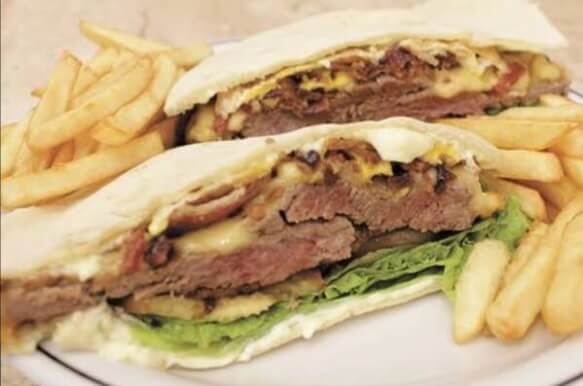Pão sírio, 150gramas de bife , dois ovos fritos ,presunto sadia ,bacon , queijo prato , alface crespa , tomate, maionese temperada e batatas fritas