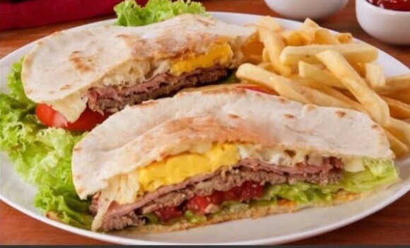 Pão sírio, dois ovos fritos, presunto sadia, bacon , queijo prato , alface crespa , tomate , maionese temperada e batatas fritas